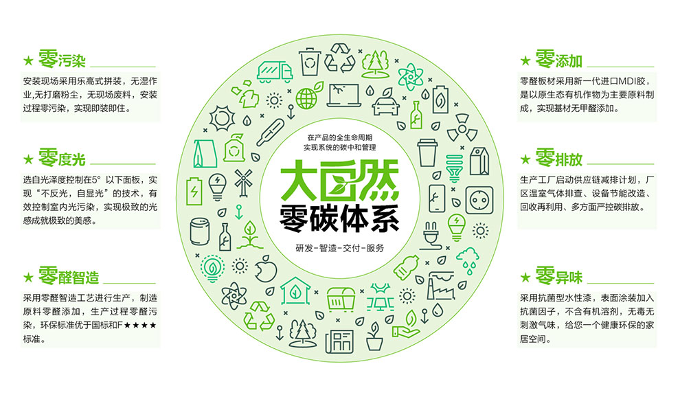 大自然家居一直秉承“擔環(huán)保責任 普健康生活 做健康家居”的企業(yè)使命,實施“中國綠色版圖”工程、綠色搖籃工程、原材料合法性工程、“雙碳”工程和產品“六零”工程,并致力于探索經濟發(fā)展與環(huán)境保護之間的平衡,以切實的行動積極推進“雙碳”戰(zhàn)略目標。